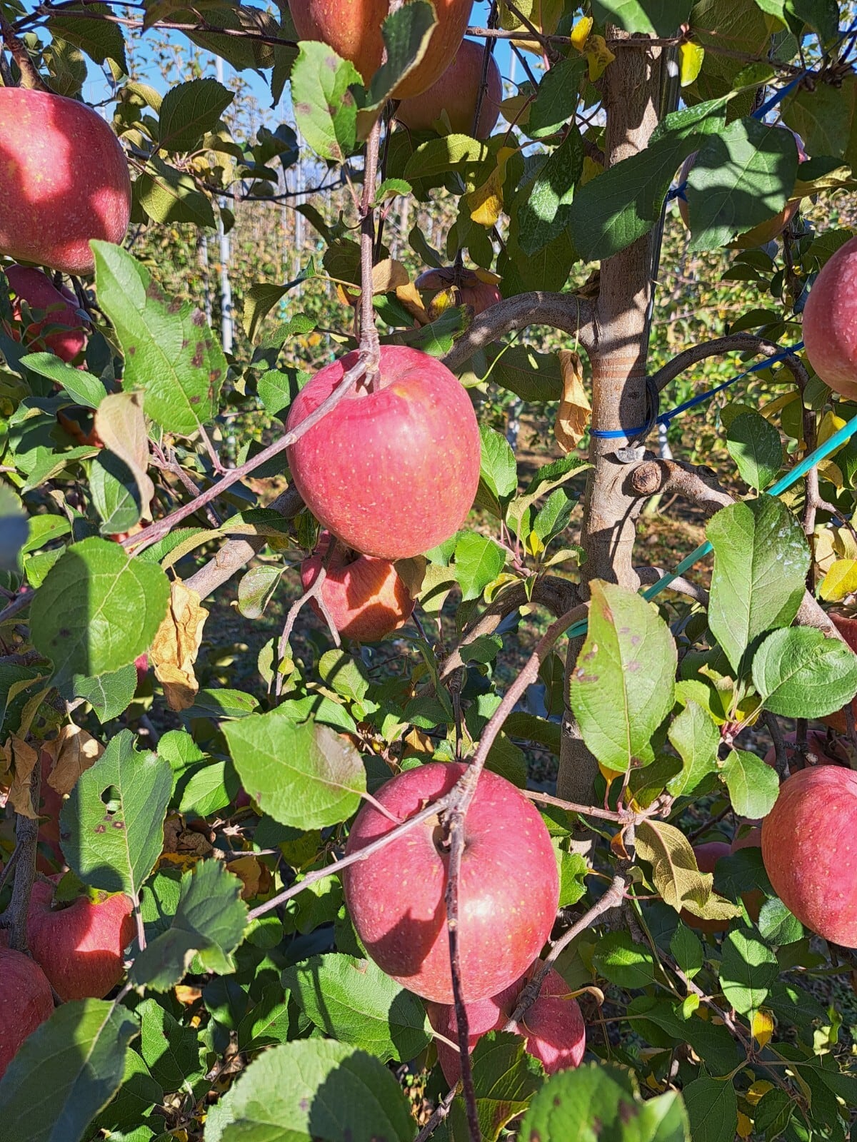果汁が多く、さわやかな酸味と甘みが特徴のバランスに優れた品種です。安曇野では寒暖差、日照時間の長さにより晩秋まで樹上で完熟させた実には蜜が入ります。